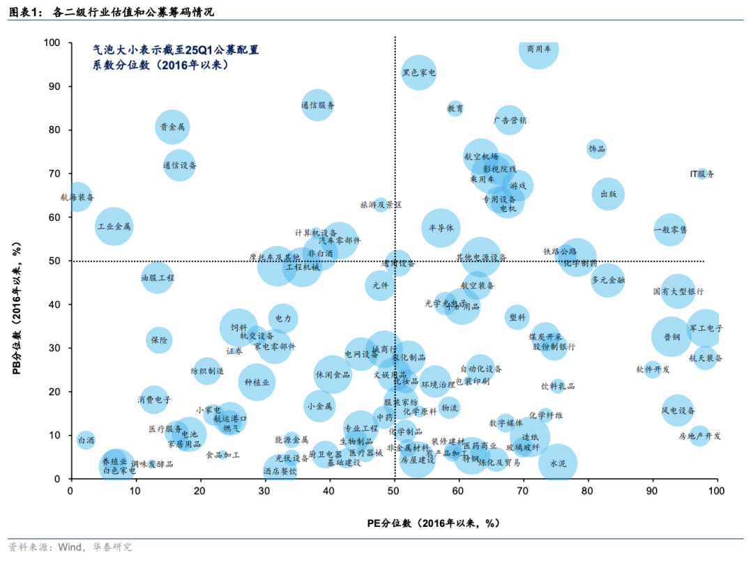 今年以来,宏观环境不确定性下市场呈现“重赔率、重左侧、重交易”的特征,当前投资者关注低位品种的安全边际和补涨空间。首先,考虑估值和筹码拥挤度,当前PE、PB和公募配置系数分位数均处于2016年以来中枢下方的行业包括养殖业/能源金属/小家电/厨卫家电/食品加工/调味品/证券/保险/生物制品/医疗器械/医疗服务/轨交设备/光伏设备等,若放宽对盈利周期底部行业PE的要求,则炼化及贸易/普钢/化学纤维/风电设备/航空装备/软件等或亦具备性价比。进一步地,考虑交易拥挤度,上述行业中交易拥挤度降至底部或低位企稳回升的行业包括保险/轨交设备/光伏设备/航空装备等。